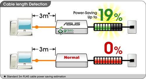 The ASUS GNT features embedded energy conservation through link down and cable length detection. With link down detection, the GX-D1081 is able to detect when a computer is turned off in the network, and respond accordingly by powering down that port into standby mode to reduce power used for that port.
