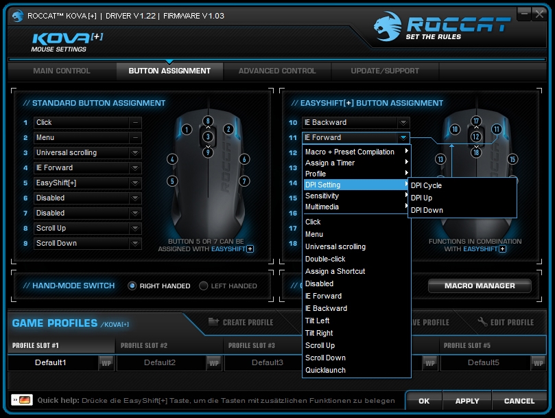 The Kova[+] also comes with the award-winning ROCCAT Macro Manager. Use the Macro Manager to create short or even very long and complex command sequences for your applications and games. Just like the predefined ones supplied with the driver, these custom macros can be assigned really easily to any one of the mouse buttons and of course as a dual-assignment in combination with the Easy-Shift[+] button.