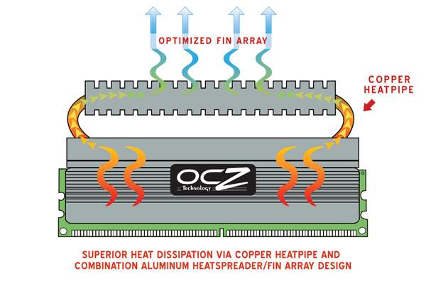 * The Reaper HPC series uses heat pipe technology to rapidly remove heat from the main body of the memory modules and conduct the thermal load to the extended radiator fin array. The addition of the extended fin array nearly doubles the total surface area available for heat dissipation while the heat pipes warrant near isothermicity throughout the entire design. The result is a doubling in effective heat dissipation at equal delta t or, in real systems, a significantly lower operating temperature of the memory modules. **OCZ EVP (Extended Voltage Protection) is a feature that allows performance enthusiasts to use a VDIMM of 2.4V 5% without invalidating their OCZ Lifetime Warranty.