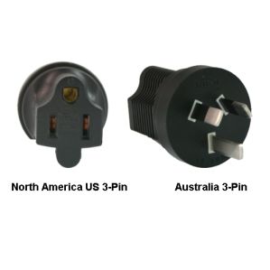 Black in-line power adapter to convert from 3 pin US to Australia power plug. This adapter is an attractive black plastic, in line molded adapter to convert the US plug type (NEMA 5-15R) to the Australian AS3112 standard plug.