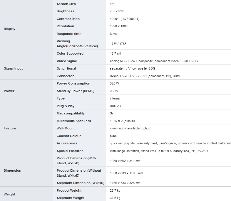 The Samsung 46" 460UX-2 LCD Video Wall display features Advanced Cooling technologies that allow reliable operation 24 hours a day, 7 days a week. WIth thin 11 mm bezels (.43"), you can build virtually seamless video walls up to 5 x 5. The 460UX-2 also has up to 700 cd/m max brightness, 1080p resolution, and is compatible with our MID46 interlocking assembly kits.