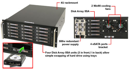 You can start your RAID Rack with as little as one hard drive and expand by adding more hard drives as your storage requirement grows. Depending on the model, the 20 hard drives are set up as 4 RAID groups that connect to the system with 4 eSATA cables or a single Multilane cable. There is also choice of models with hot swappable redundant power supply for mission critical applications.