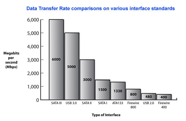 eSATA (USB with optional adapter) for external connection and SATA for internal connection via Diamond drive cradle |