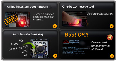 MemOK! quickly ensures memory boot compatibility. This remarkable memory rescue tool requires a mere push of a button to patch memory issues. MemOK! determines failsafe settings and dramatically improves your system boot success. Get your system up and running in no time!