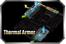 New generation TUF Thermal Armor kicks cooling up a notch with dual integrated Turbo Engine fans. This enhances the original TUF thermal design, helping direct heat away from MOS area components and out the case via the rear I/O section. Special heat pipes propel dissipation from critical components and make sure temps stay low across the board. The Thermal Armor also provides modders and LAN party goers an extra-cool dress up option to show off their creativity and dedication to performance.