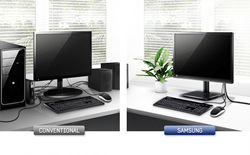 Samsungs innovative Cloud Display integrates a thin client into the LED screen for greater efficiency. Its contemporary and innovative design ensures that keeping your work environment clean and tidy is simple. The benefit of having a separate thin client box is that professionals can use their desk space in a much more efficient manner. Other great features include Power-over-Ethernet option, which reduces a power cable by providing power through a LAN cable, and the embedded speaker system. These innovative features come together perfectly for an all-in-one design that enhances desktop productivity.