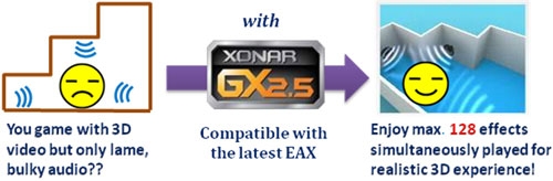 The exclusive ASUS GX 2.5 gaming audio engine on the Xonar DGX 5.1 allows up to 128 different sound effects simultaneously for a realistic 3D audio environment. It also offers full compatibility with the latest version of EAX.