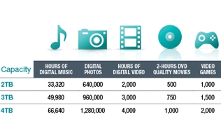 With a 30% capacity improvement over competitive offerings and excellent cost-per-terabyte, choose between 2, 3 and 4TBfor up to 20TB of capacity in 5-bay NAS solutions. A single 4TB drive translates to: over 1 million photos, 180 days of music, 1000 hours of DVD video, OR enough space to support the CAD files, images and databases needed by small businesses.