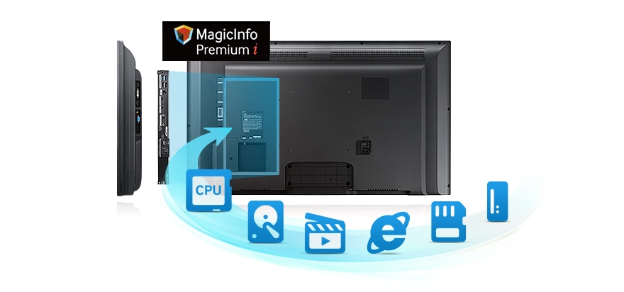 Featured at the high end of the MagicInfo media player family, MagicInfo Premium i Player supports enhanced content display features. The player connects to Samsung MagicInfo Server to enable the display of Really Simple Syndication (RSS) feeds and special effects, and supports advanced features including interactive content and integration with database information.