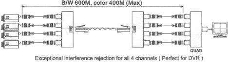 This 4 way video sender transmits video signals over long distances. It replaces the need to use expensive coaxial cable by using one Cat 5 UTP cable instead of 4 individual coaxial cables. It can transmit four channels of video up to 600m (B+W) or 300m (colour). BNC camera connections. No external power supply required. Two identical units are required to form a link.