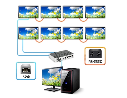 Remotely controlling multiple displays become easier on Samsung displays. The displays can be simultaneously controlled with RS-232C for displays in proximity or with RJ-45 and the built-in LAN card for displays located over a long distance. Users can control the displays using Samsungs Multi Display Control (MDC) programme or any other control programme that is supported by protocol.