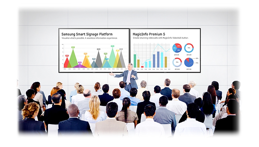 You can create multimedia and interactive content easily with pre-made templates. Customise your message using the intuitive user interface. Content can be played on multiple displays from a central PC, directly from internal storage or from a USB drive through plug and play. You can also efficiently monitor and schedule various types of content on multiple displays from one central location. These features of the embedded Samsung MagicInfo Premium S player come at no additional cost. With SSSP and the MagicInfo Premium S player, monitoring display status and controlling display operation have never been simpler.