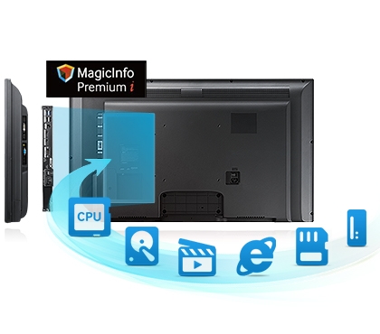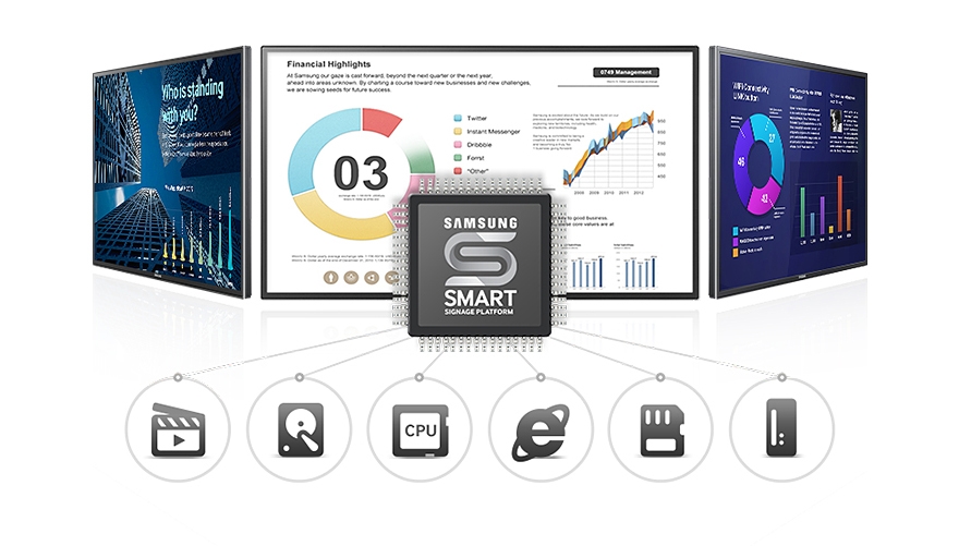 Samsung Smart Signage Platform (SSSP) is embedded within Samsung displays, providing the power of a dual-core CPU and a combination of media player and integrated display solution, MagicInfo Premium S player. The solution eliminates the need for additional PC modules, making installation and maintenance easier by providing all the necessary functions for display operation in a single display.