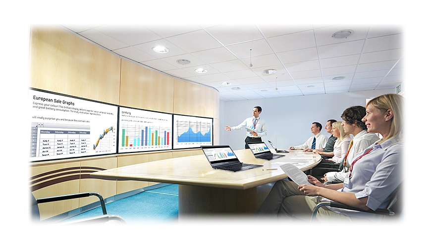ME75C displays are an exceptional choice over projectors and screens for delivering content in a meeting room. Slim and light with narrow bezels, these digital signages are easy to handle and install. Unlike projected images in a darkened room, digital signage presentations retain picture quality with broad colour ratios, deep blacks and sharp images, even in bright light. Content shown on ME75C displays has virtually no distortion. Images arent blurred when the screen is touched. The presenter isnt dazzled by light from a projector, nor does the presenter throw a shadow on the screen. The reduced light scatter and reduced reflection make the content easier to read, increasing audience concentration.