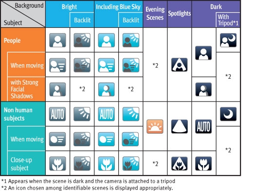 P, Live View Control, Auto, Portrait, Face Self-timer, Low Light, Fish-eye Effect, Miniature Effect, Toy Camera Effect, Monochrome, Super Vivid, Poster Effect, Snow, Fireworks, Long Shutter