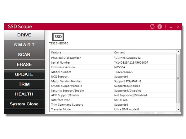 To keep your Transcend SSD running fast, clean, and error-free, the advanced SSD Scope software application is available to download and work with the SSD370. SSD Scope allows you to monitor SSD370 health status with S.M.A.R.T. technology, enable the TRIM command in the operating system to help maintain optimum write speeds, and conveniently update SSD firmware, all from a single user-friendly tool.