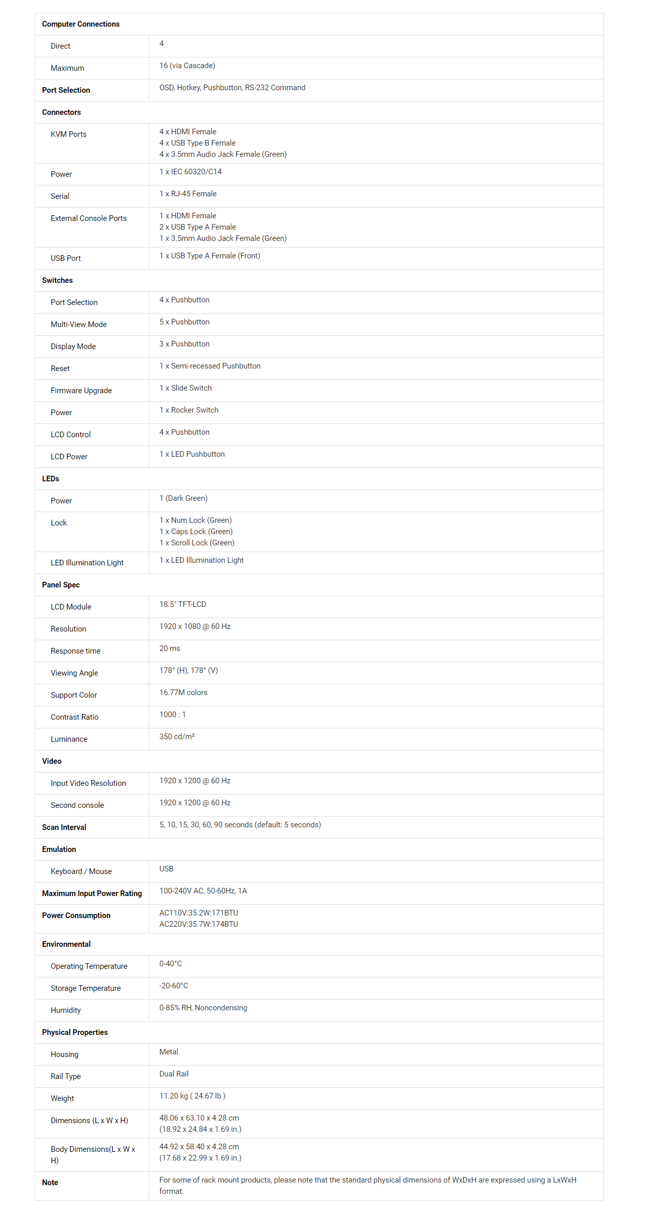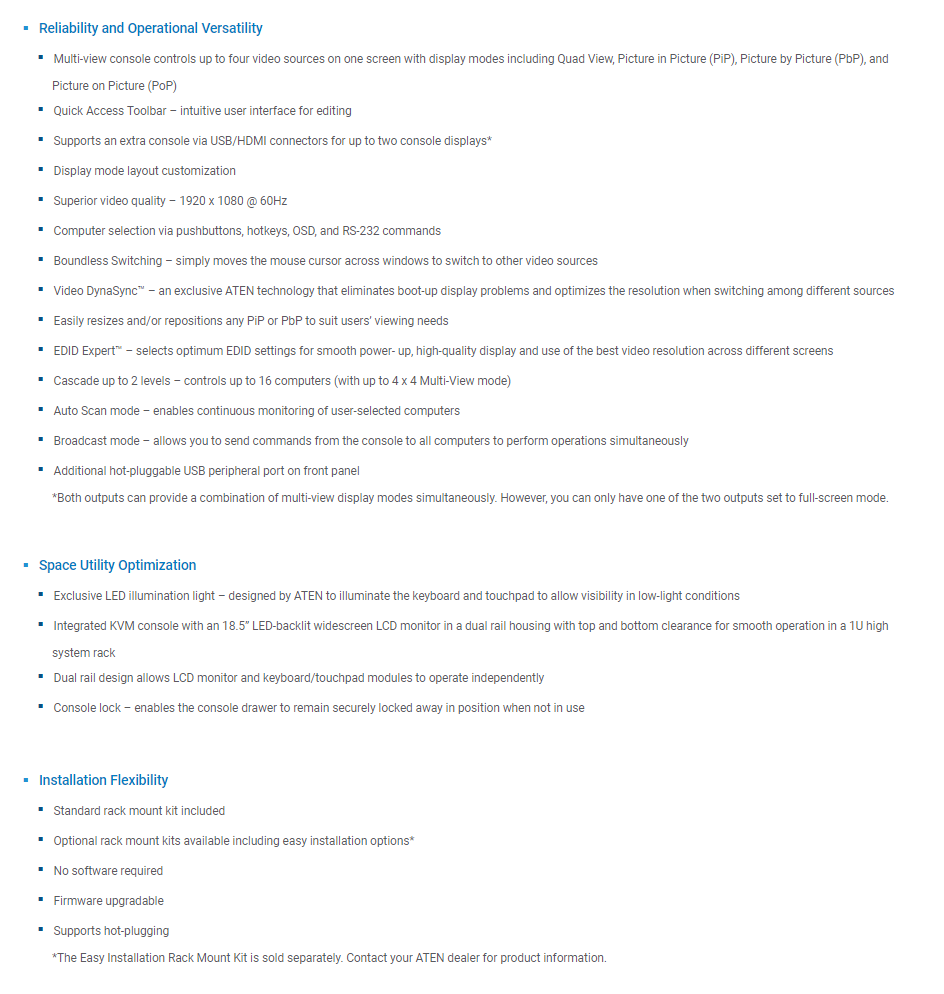 Aten 18.5" Short Depth 4-Port HDMI LCD KVM with Dual Rail and widescreen support, panel resolution of 1920 x 1080 @ 60 Hz, with included multi-view modes for viewing multiple inputs simultaneously, boundless switching between inputs in multi-view mode