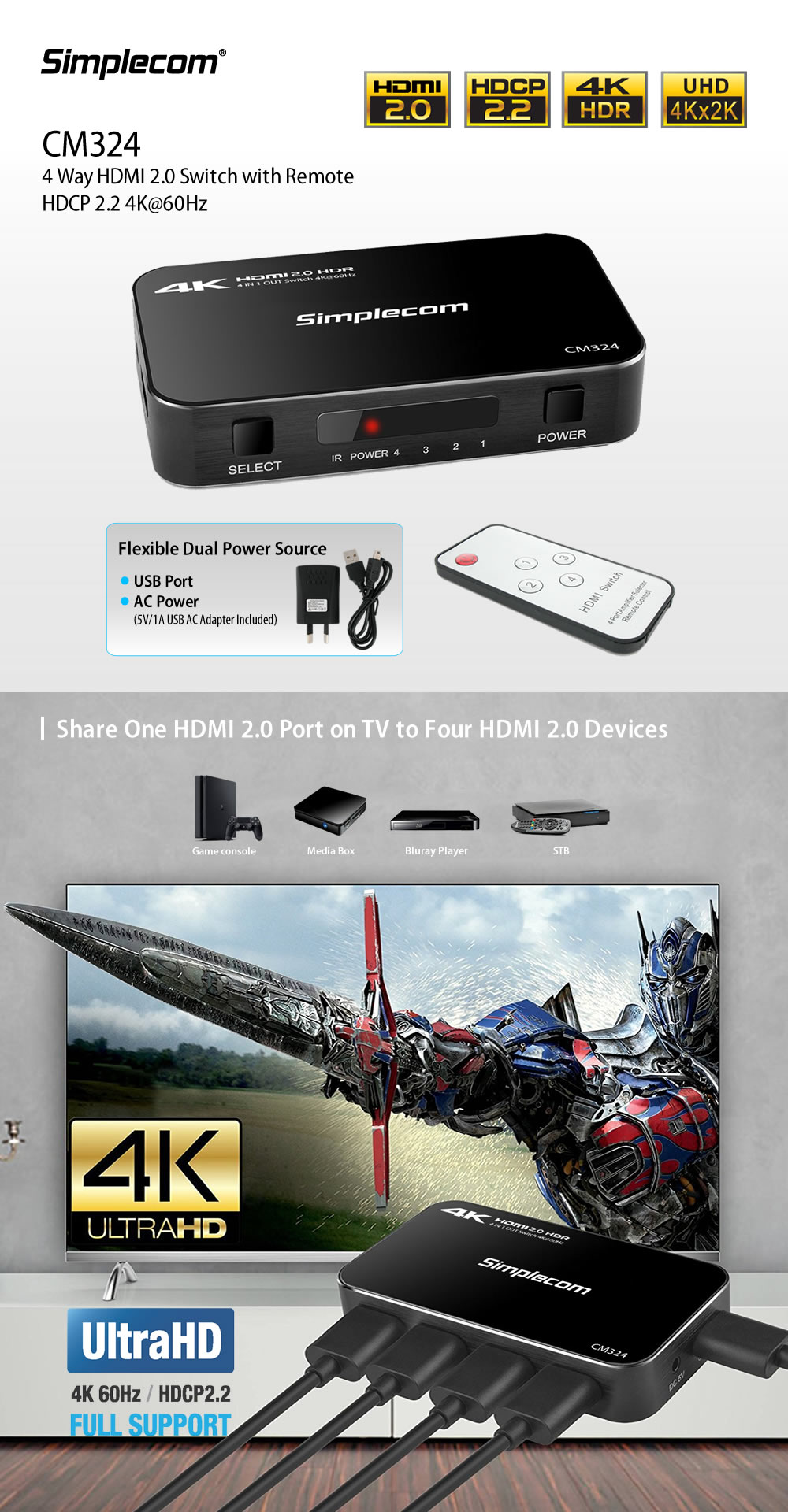 CM324 is a 4 Way HDMI 2.0 4K switch for your latest gaming or home theatre