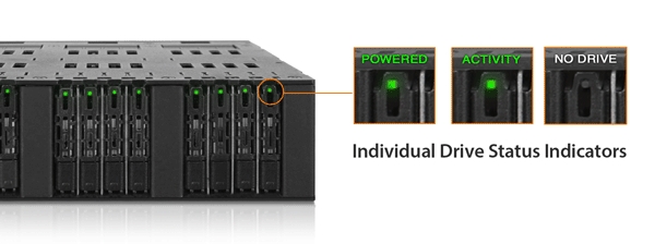 Powering up the twelve drives at once can accumulate heat. Therefore, we have included a 40mm cooling fan with adjustable 3-Mode fan speed control, providing airflow throughout the entire cage. Depending on your requirement, select the proper fan speed to keep the drives at optimal operating temperatures, even under heavy load. |