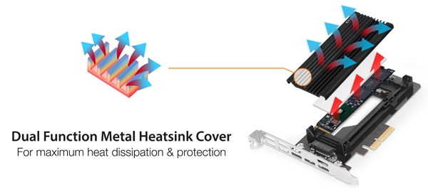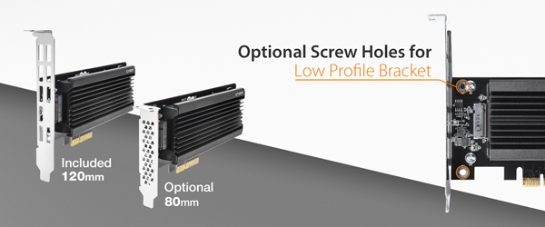 | Optimal Cooling |  | The specialized aluminum lid acts as a heat sink to keep M.2 NVMe SSD at safe temperatures, even under heavy load. | |  | The included thermal pad can be placed on the aluminum heatsink lid's underside for enhanced heat dissipation. | |  | The large ventilation cut out underneath the M.2 SSD provides maximum airflow throughout the drive offers optimal cooling efficiency. | | | Support Different System Heights |  | The PCIe slot bracket of the MB987M2P-1B can be swapped between full and low profile for flexible system installation. If you have a need to customize the units by swapped an aftermarket low profile PCIe bracket (not included), go right on ahead --weve added the necessary screw hole spacing for this purpose. | | | Packed with Features |  | The MB987M2P-1B is equipped with drive activity LED indicator that shows the drive power and activity. The LED is automatically powered off when no drive is installed to save power. | |  | The optional 2-pindriveactivity signal output (cable not included) allows you to transfer the drive activity signal to the front panel of the computer to monitor the drive activity. |
