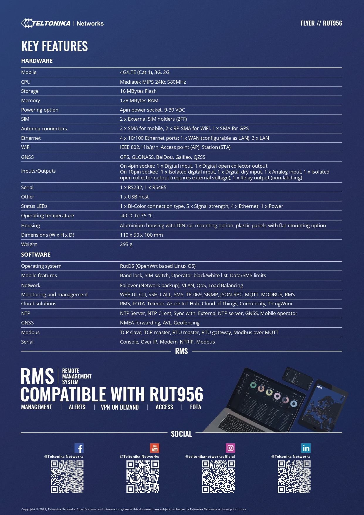 Teltonika RUT956 - Dual-SIM cellular 4G LTE, WAN failover, with 4x Ethernet ports, GPS, an I/O connector block