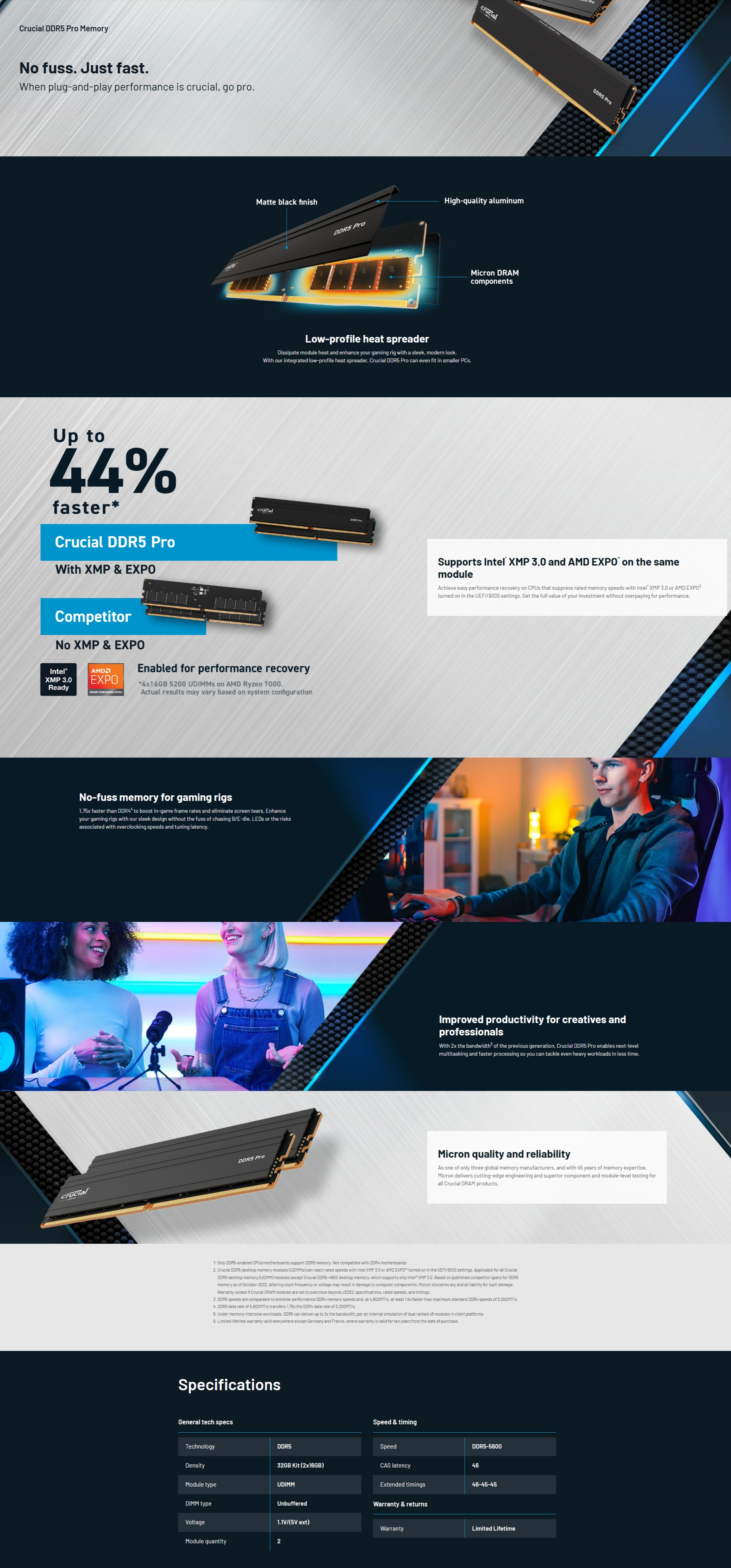 Crucial DDR5 Pro Memory has the blazing speed and massive bandwidth needed to support next-gen multi-core CPUs without the fuss of overclocking, latency tuning, die chasing, and LEDs