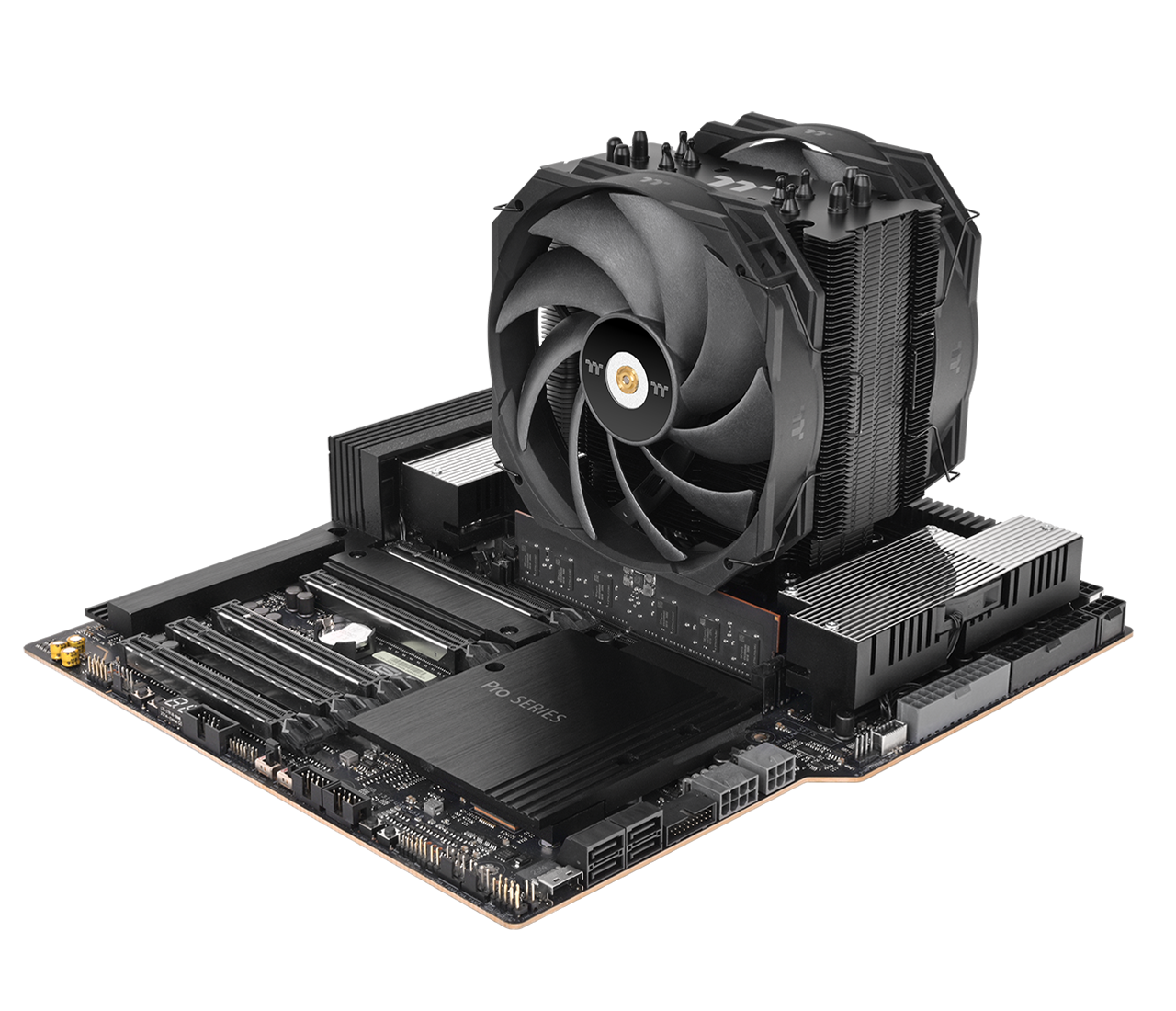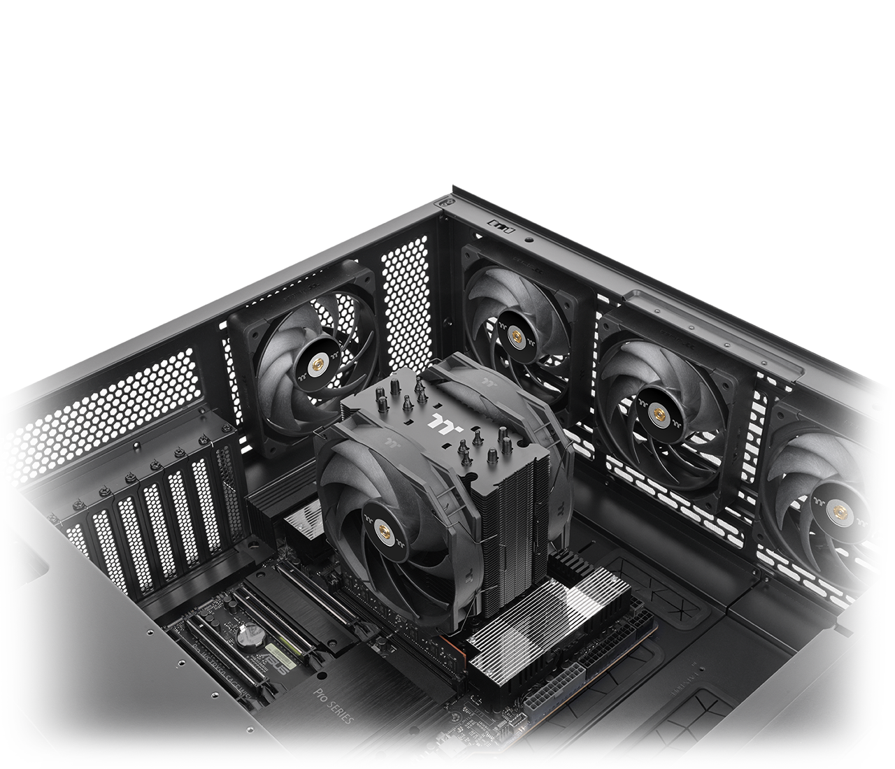 The WAir CPU Cooler is designed for workstation configurations, supporting Intel LGA4677 and AMD sTR5/SP6 sockets. It features a single-tower dual-fan design, six high-performance heat pipes, and is paired with the redesigned TOUGHFAN 14 Pro, delivering an impressive 500W TDP of cooling power for intensive tasks like 3D rendering and AI computing. Its all-black design merges style and performance, elevating the workstation experience to the next level.