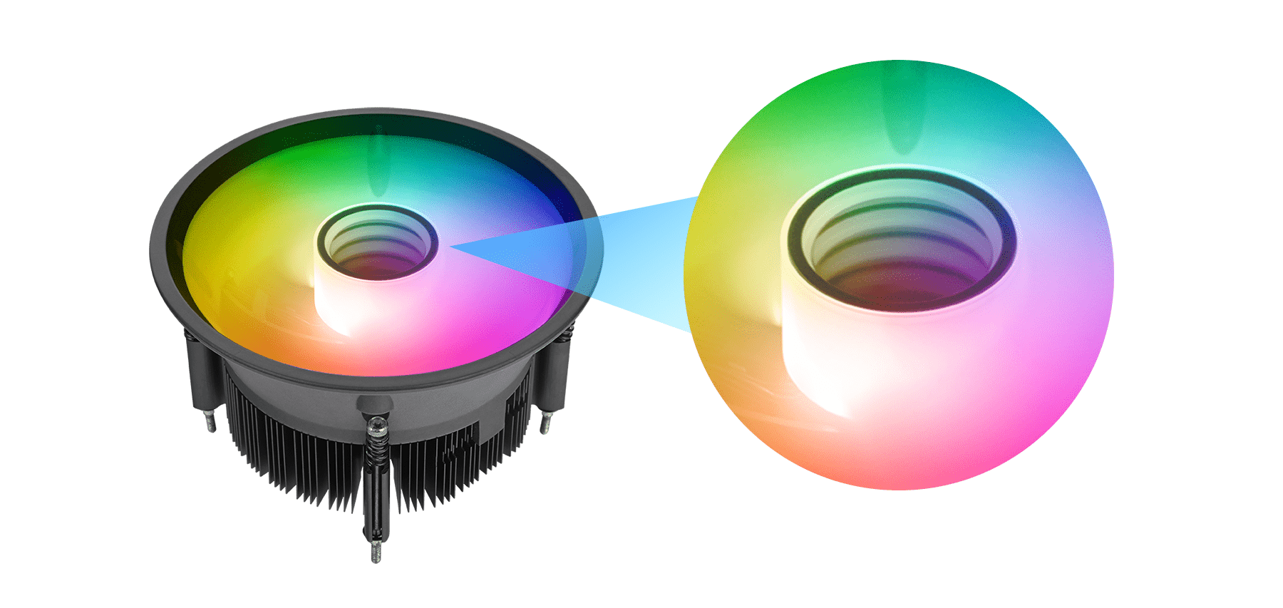 The UX150 ARGB Sync features a 130mm high-airflow fan that delivers up to 130W of cooling power. Designed with an infinity mirror style lighting effect at the center and customizable lighting effects controlled via motherboard sync software, it enhances the overall aesthetics.