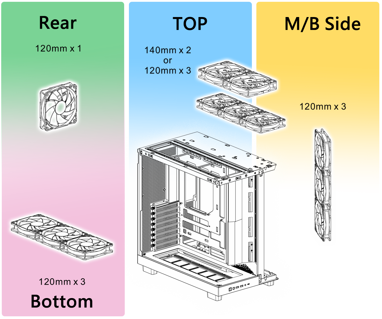 FAN SUPPORT | Top: 3 x 120mm, 2 x 120mm, 1 x 120mm, 2 x 140mm, 1 x 140mm