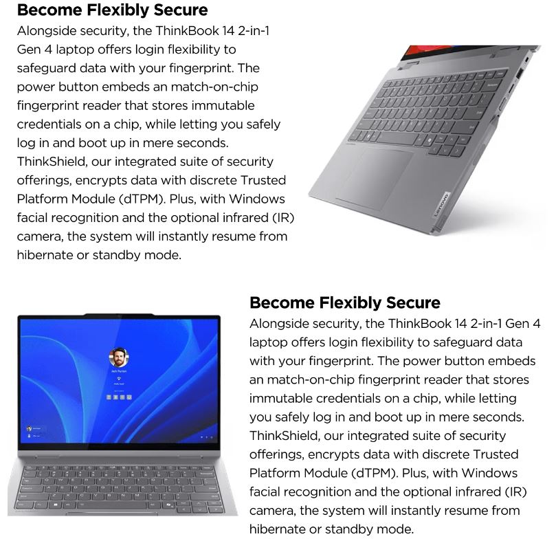 Docking Various docking solutions supported via Thunderbolt or USB-C. For more compatible docking solutions, please visit Docking for ThinkBook 14 2-in-1 G5 IAU