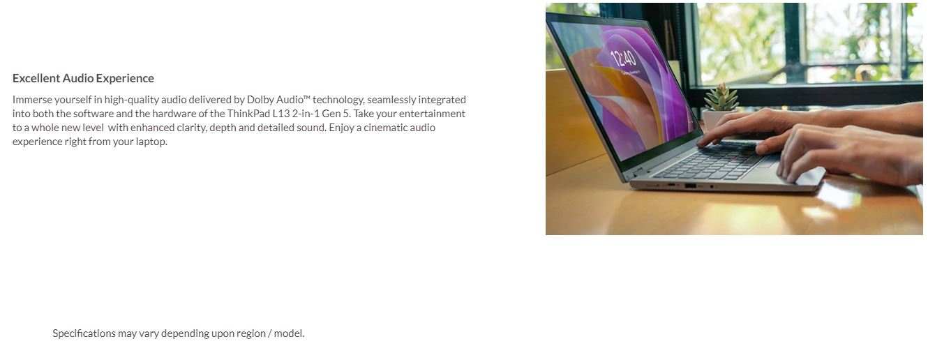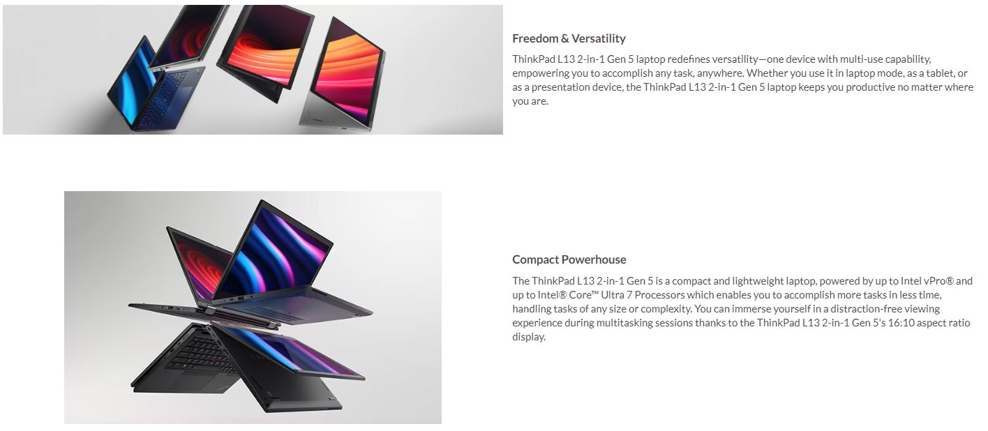 Docking Various docking solutions supported via Thunderbolt or USB-C. For more compatible docking solutions, please visit Docking for ThinkPad L13 2-in-1 Gen 5 (Intel)