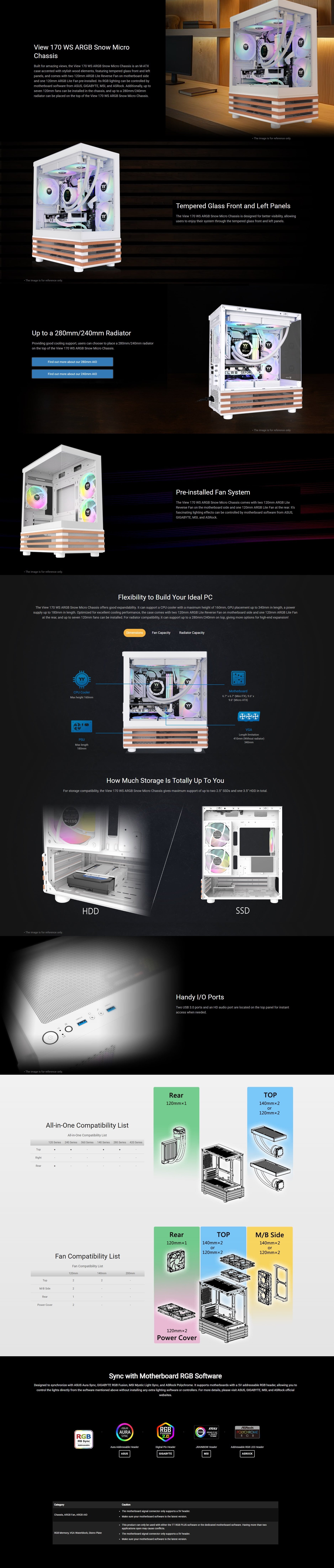 Built for amazing views, the View 170 WS ARGB Snow Micro Chassis is an M-ATX case accented with stylish wood elements, tempered glass front and left panels, and comes with two 120mm ARGB Lite Reverse Fan on motherboard side and one 120mm ARGB Lite Fan at the rear.