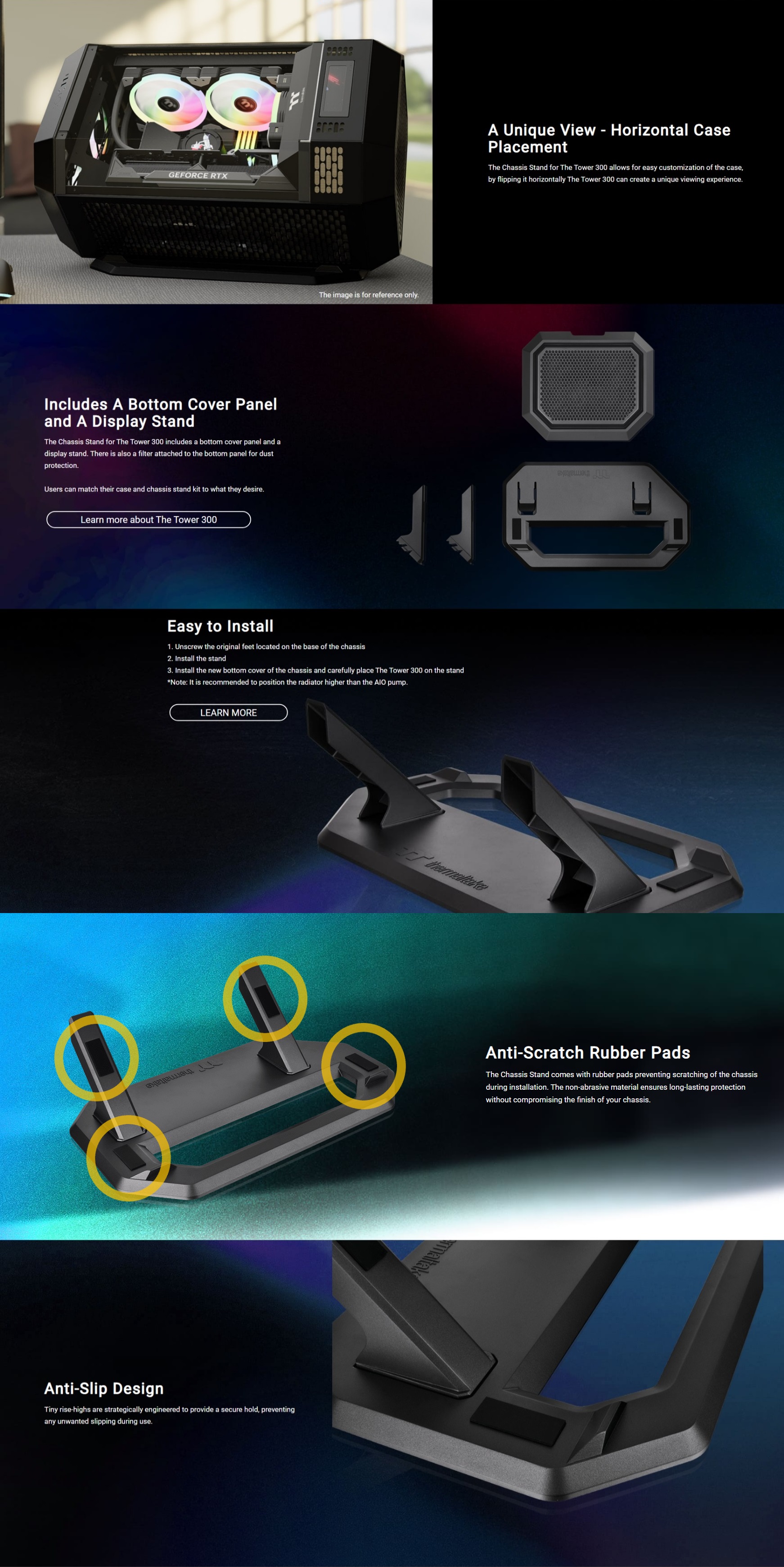 The Chassis Stand for The Tower 300 includes a bottom cover and a display stand, giving users another option to display their Tower 300 horizontally for easy case customization and a unique viewing experience.