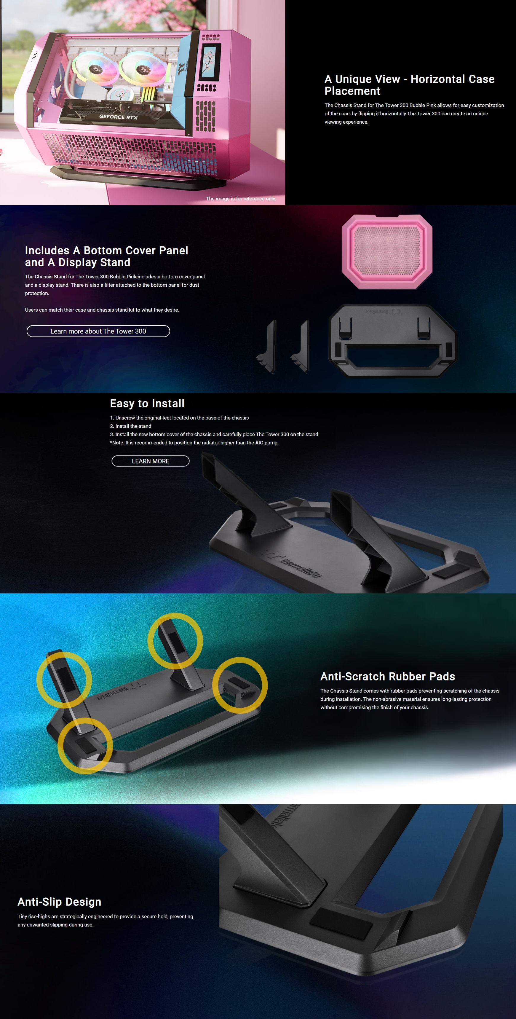 The Chassis Stand Kit for The Tower 300 Bubble Pink includes a bottom cover and a display stand, giving users another option to display their Tower 300 horizontally for easy case customization and a unique viewing experience.