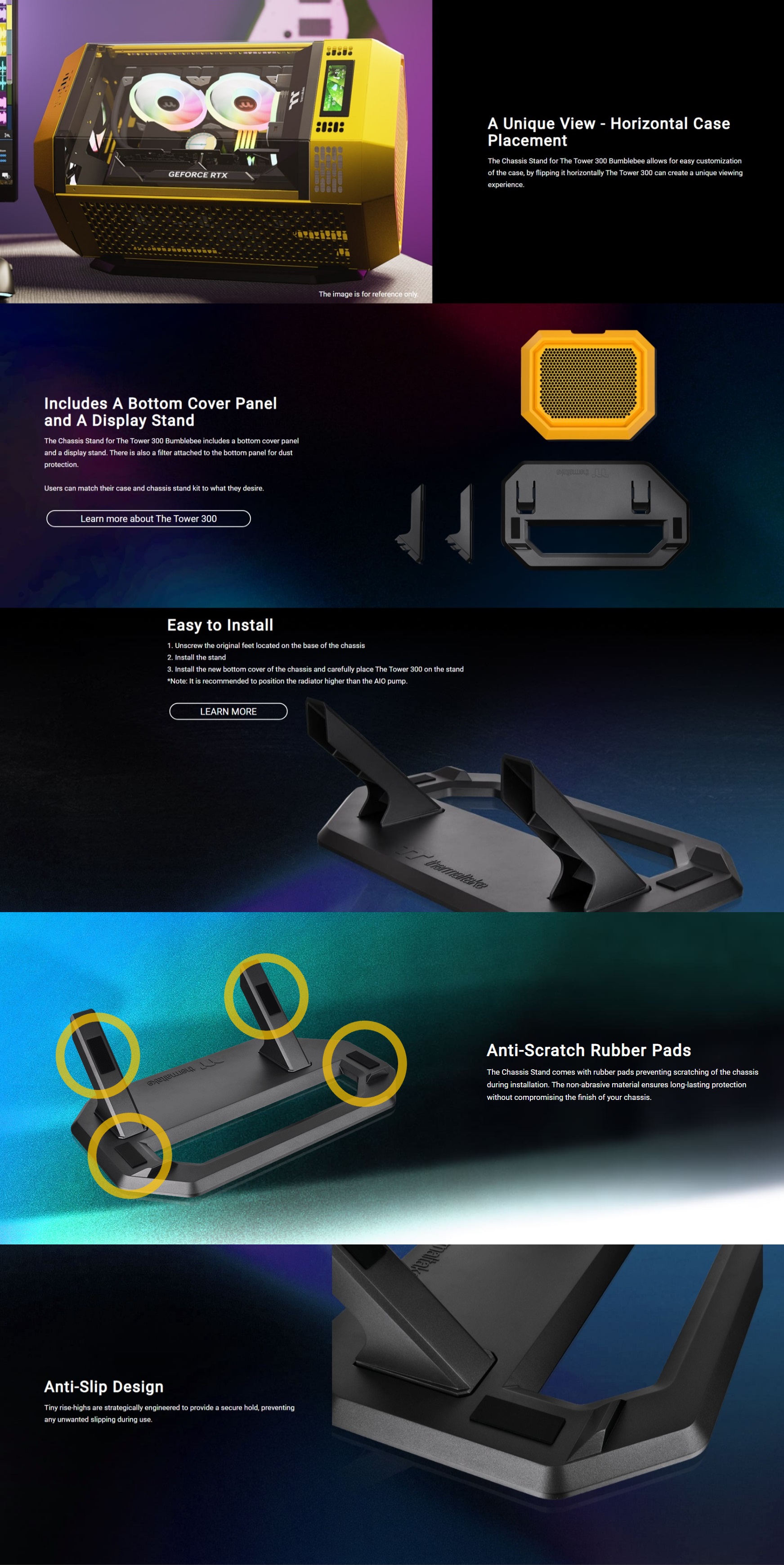 The Chassis Stand Kit for The Tower 300 Bumblebee includes a bottom cover and a display stand, giving users another option to display their Tower 300 horizontally for easy case customization and a unique viewing experience.