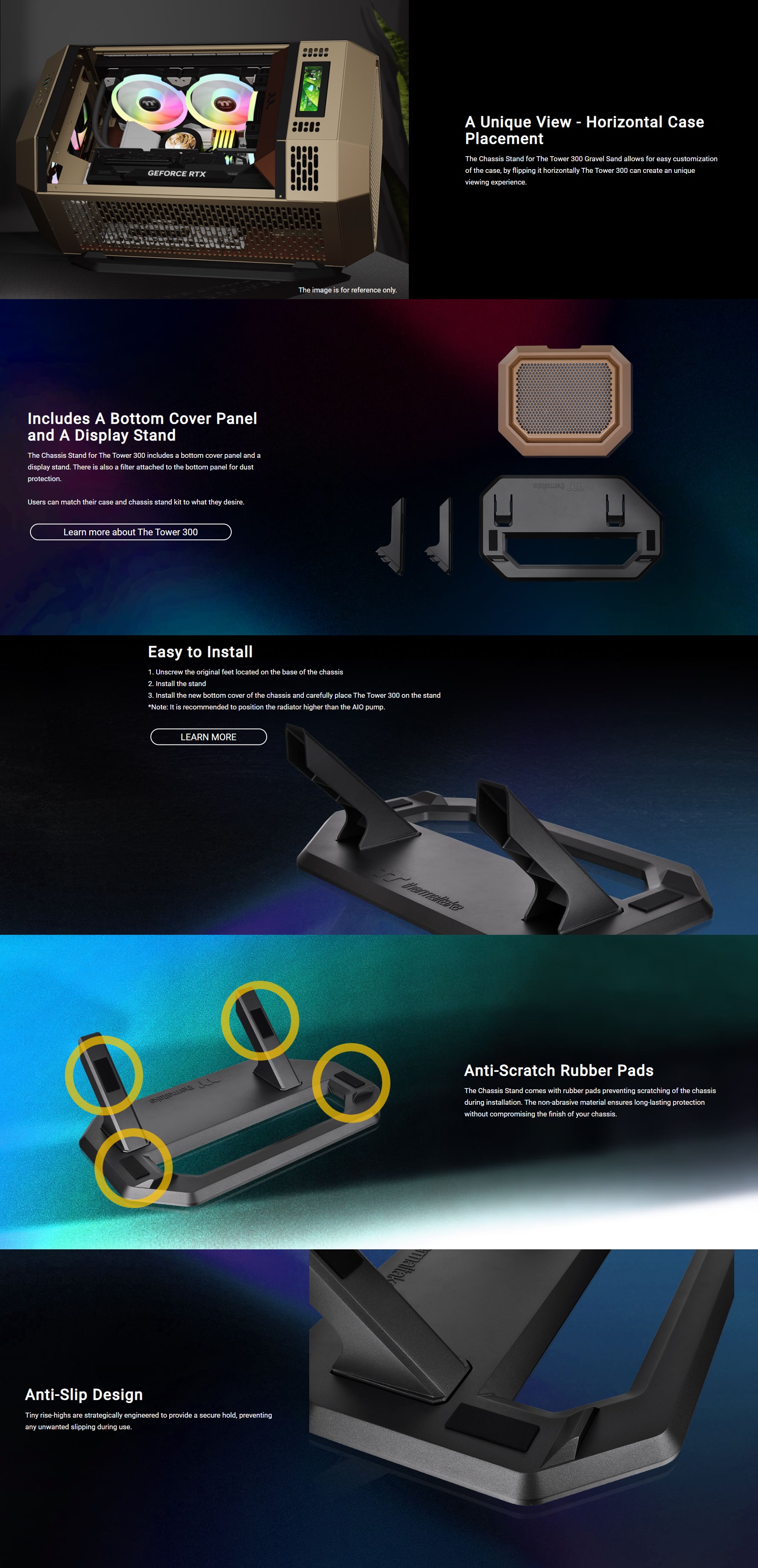 The Chassis Stand Kit for The Tower 300 Gravel Sand includes a bottom cover and a display stand, giving users another option to display their Tower 300 horizontally for easy case customization and a unique viewing experience.