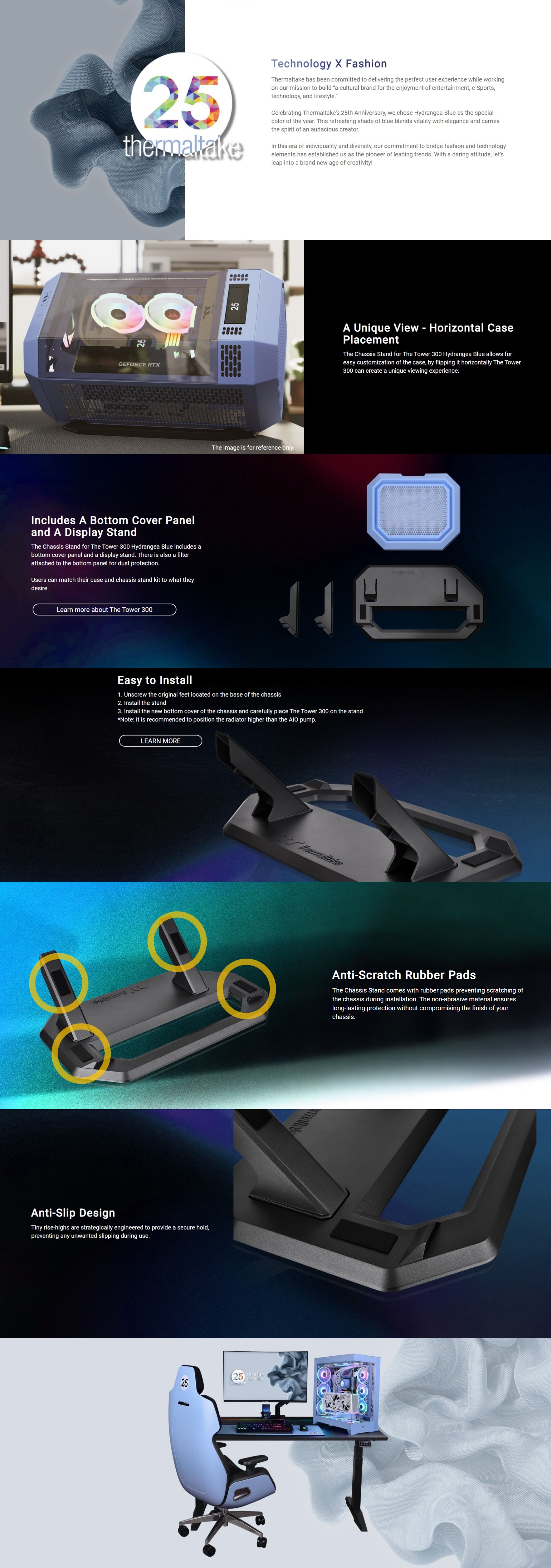 The Chassis Stand Kit for The Tower 300 Hydrangea Blue includes a bottom cover and a display stand, giving users another option to display their Tower 300 horizontally for easy case customization and a unique viewing experience.