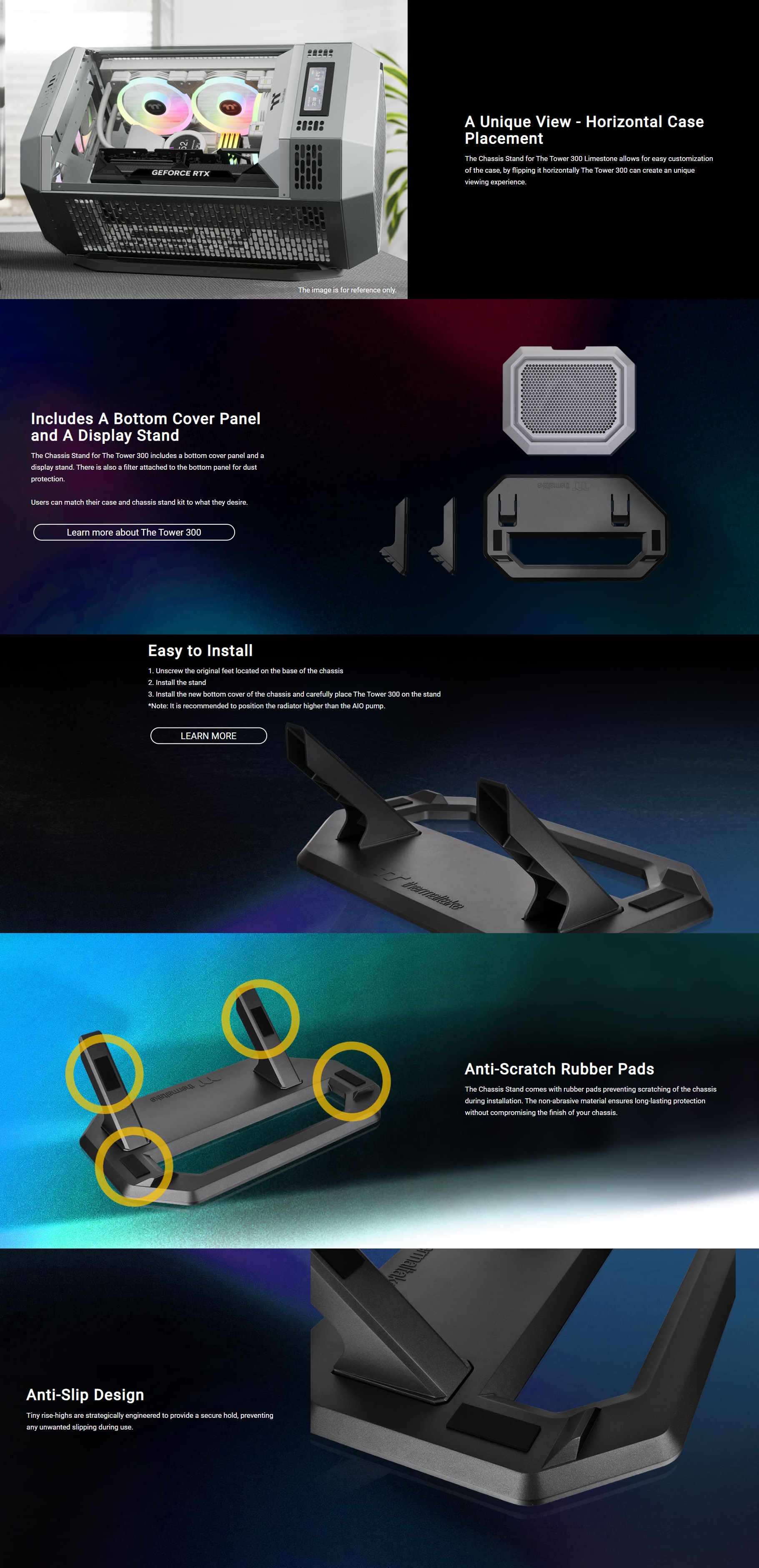 The Chassis Stand Kit for The Tower 300 Limestone includes a bottom cover and a display stand, giving users another option to display their Tower 300 horizontally for easy case customization and a unique viewing experience.