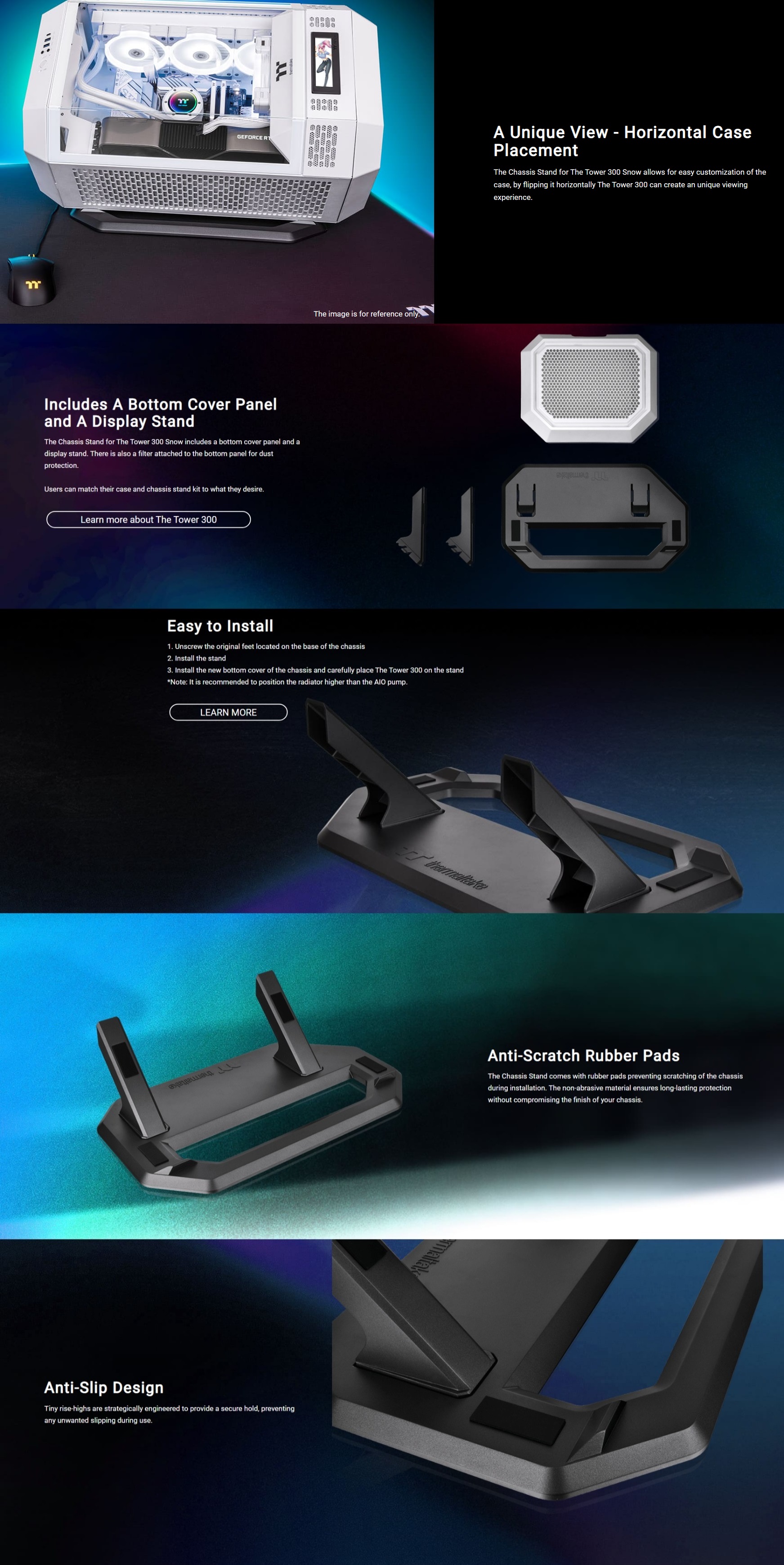 The Chassis Stand Kit for The Tower 300 Snow includes a bottom cover and a display stand, giving users another option to display their Tower 300 horizontally for easy case customization and a unique viewing experience.