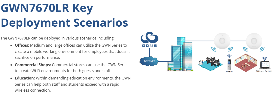 The GWN7670LR is a long-range Wi-Fi 7 access point, ideal for medium-to-large businesses that need to provide long-range coverage.