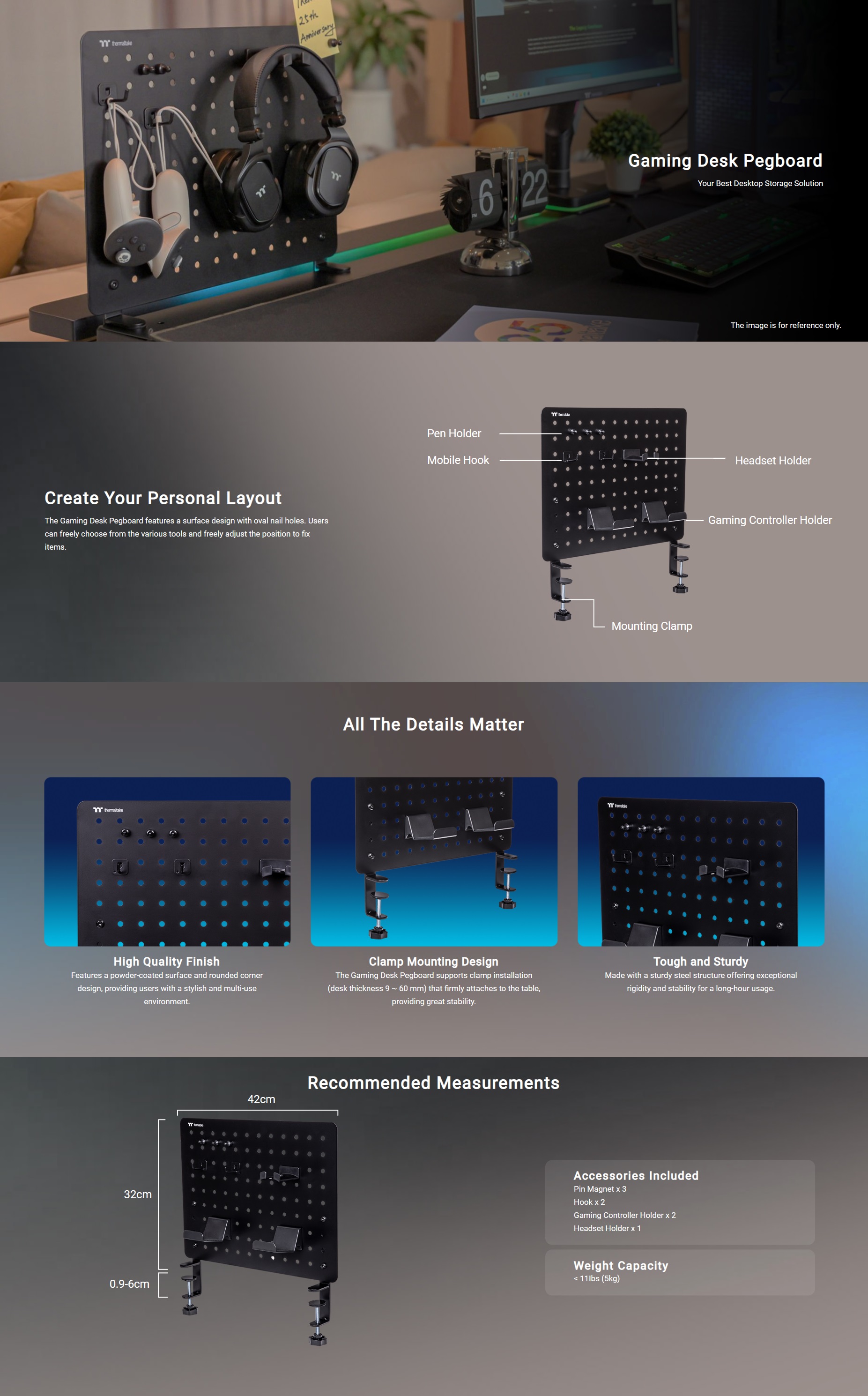 Thermaltake provides gamers and office workers with a highly compatible and easy-to-install desktop storage solution. The Gaming Desk Pegboard is a multi-functional, beautiful and stylish desk organizer and storage stand that provides more than one installation method. Also, the pegboard features a sturdy steel structure and powder-coated surface, offering rugged performance, with oval nail holes and a waterproof surface that allows users to DIY their layout.