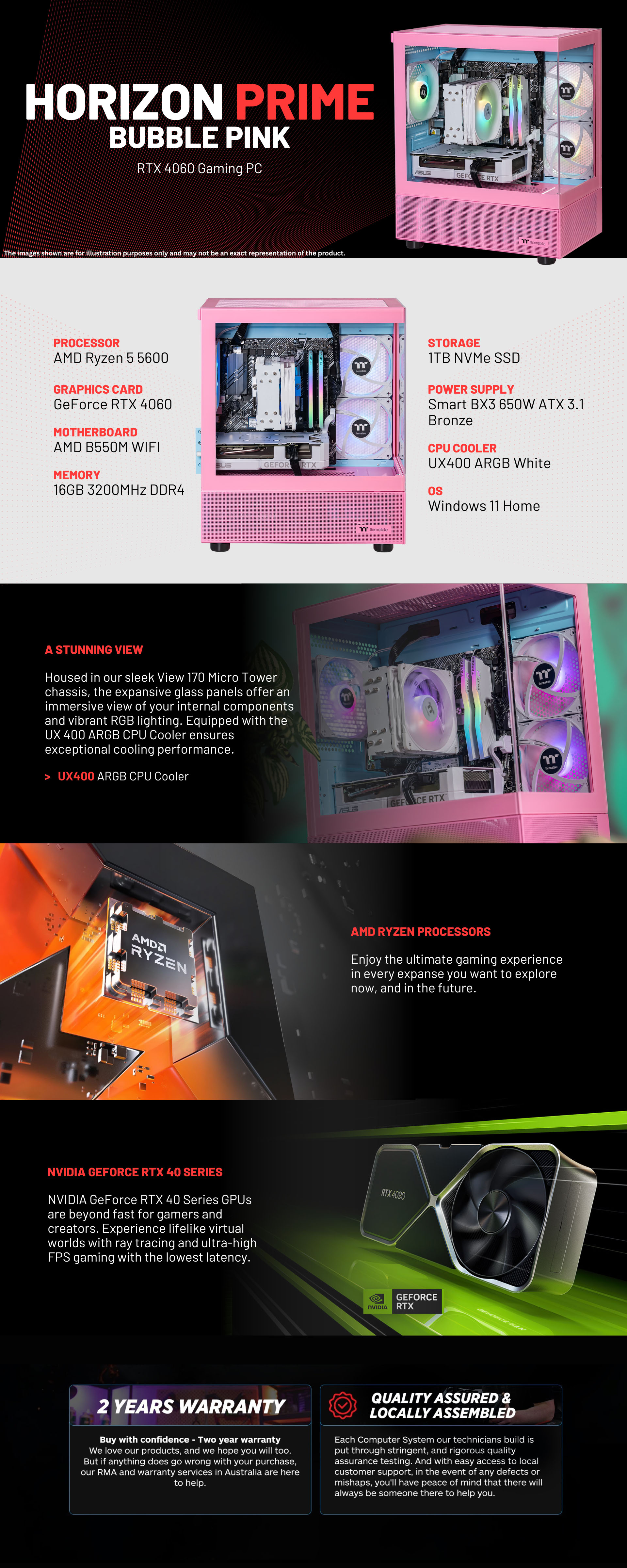 Housed in our sleek View 170 Micro Tower chassis, the expansive glass panels offer an immersive view of your internal components and vibrant RGB lighting. Equipped with the UX 400 ARGB CPU Cooler ensures exceptional cooling performance.