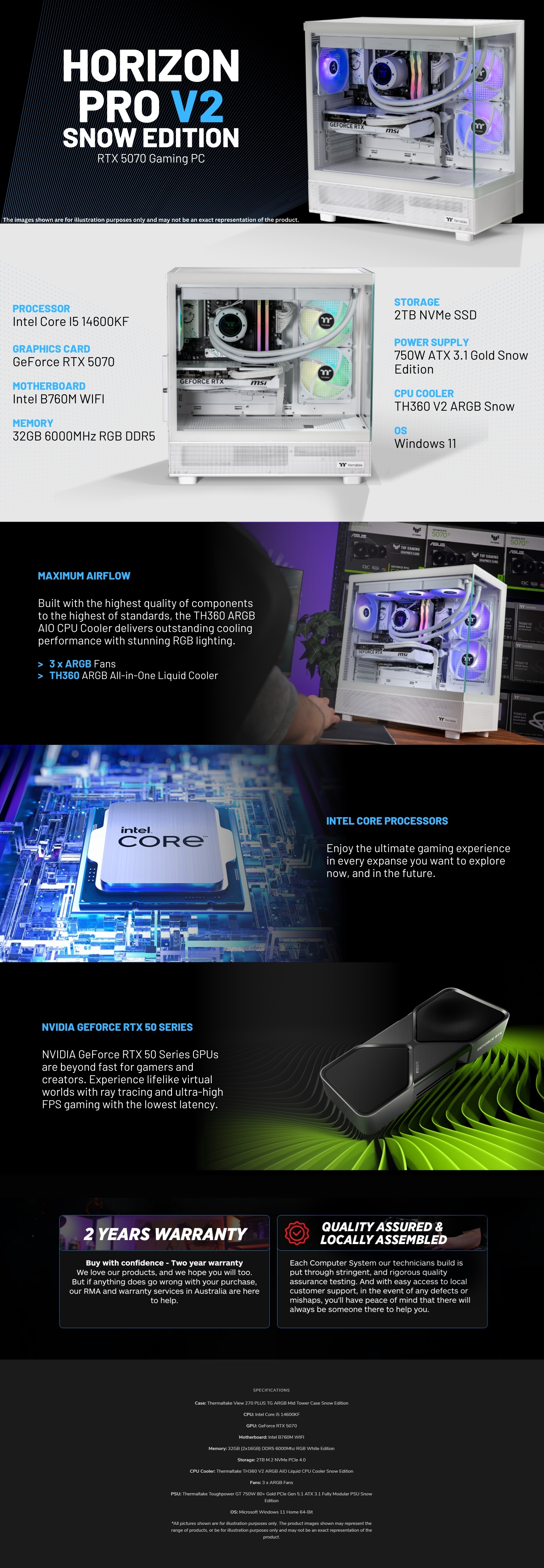Experience unparalleled gaming performance with the Horizon Gaming PC, featuring the powerful NVIDIA GeForce RTX 5070 graphics card and the cutting-edge Intel Core i5 14600KF processor. With 32GB RGB DDR5 memory running at 6000MHz, you'll enjoy lightning-fast speeds and stunning visuals.