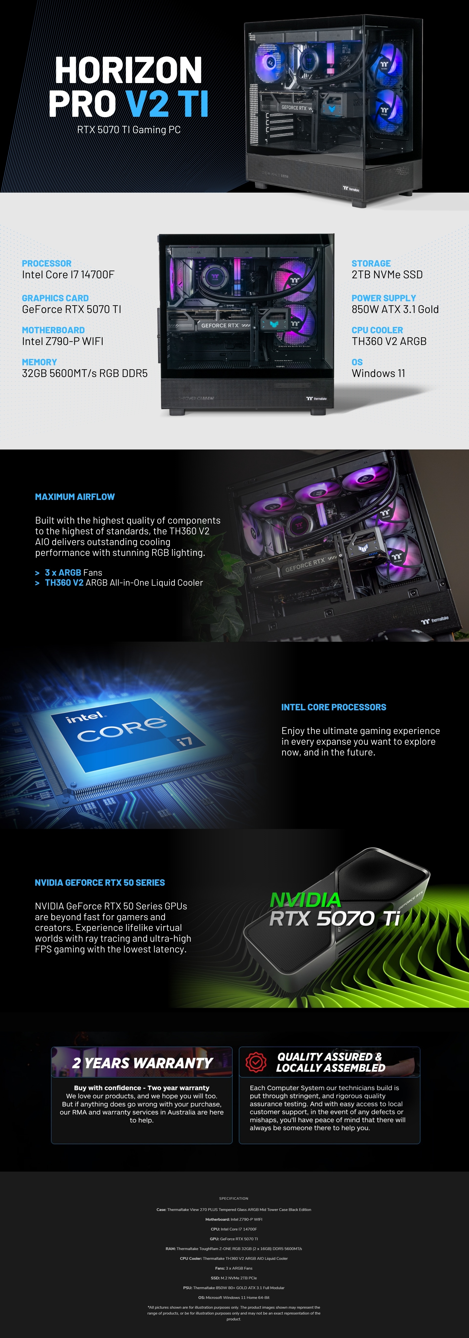 Experience unparalleled gaming performance with the Horizon Gaming PC, featuring the powerful NVIDIA GeForce RTX 5070 TI graphics card and the cutting-edge Intel Core i7 14700F processor. With 32GB of TOUGHRAM Z-ONE RGB DDR5 memory running at 5600MHz, you'll enjoy lightning-fast speeds and stunning visuals.