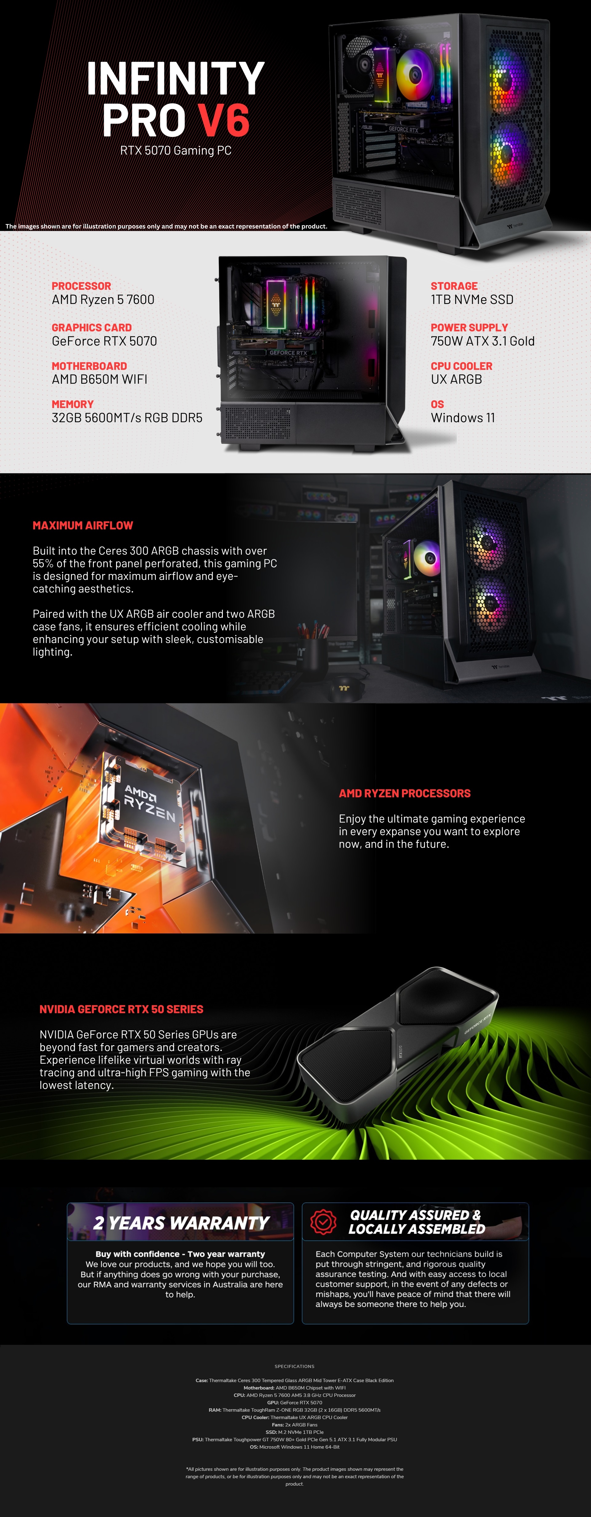 Unlock infinite gaming possibilities with the Infinity Pro V6. Housed in our stunning Ceres 300 case, This PC takes your games to a new level by utilising the best hardware. This includes a sweet 5070 GPU and an AMD Ryzen 5 7600 Processor. Dominate the game, with the Infinity Pro V6.