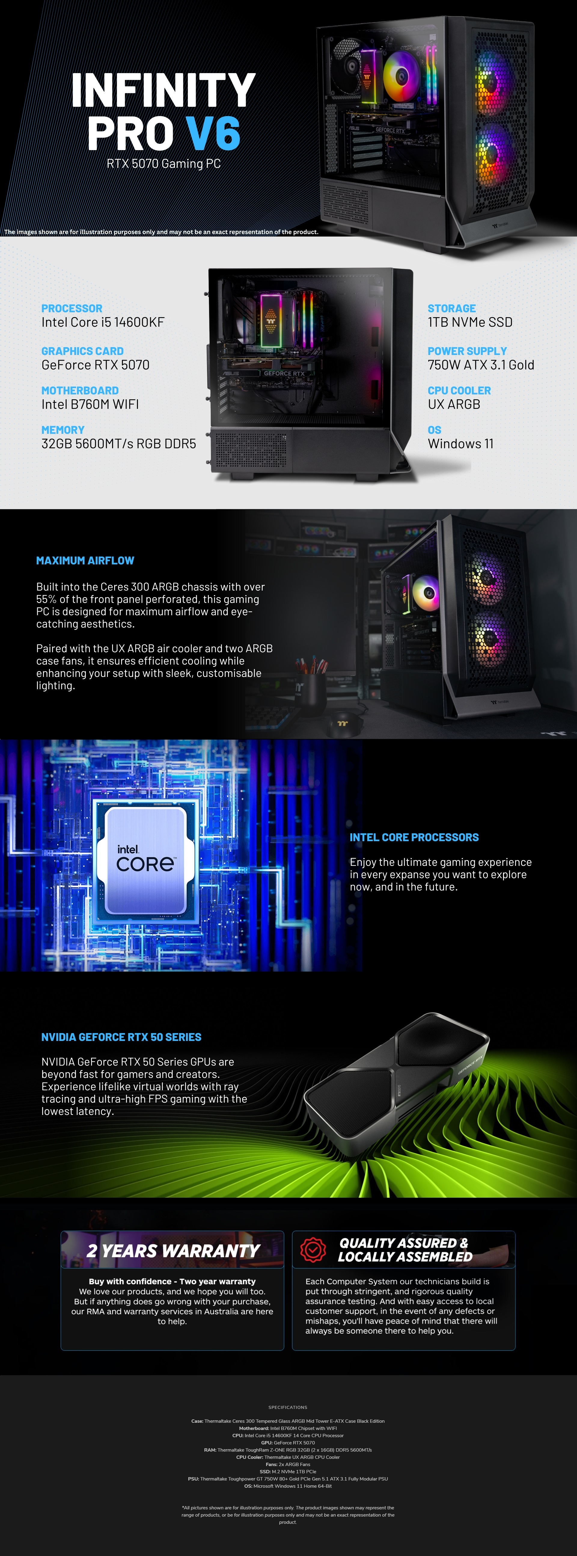 Unlock infinite gaming possibilities with the Infinity Pro V6. Housed in our stunning Ceres 300 case, This PC takes your games to a new level by utilising the best hardware. This includes a sweet 5070 GPU and an Intel Core i5 14600KF Processor. Dominate the game, with the Infinity Pro V6.