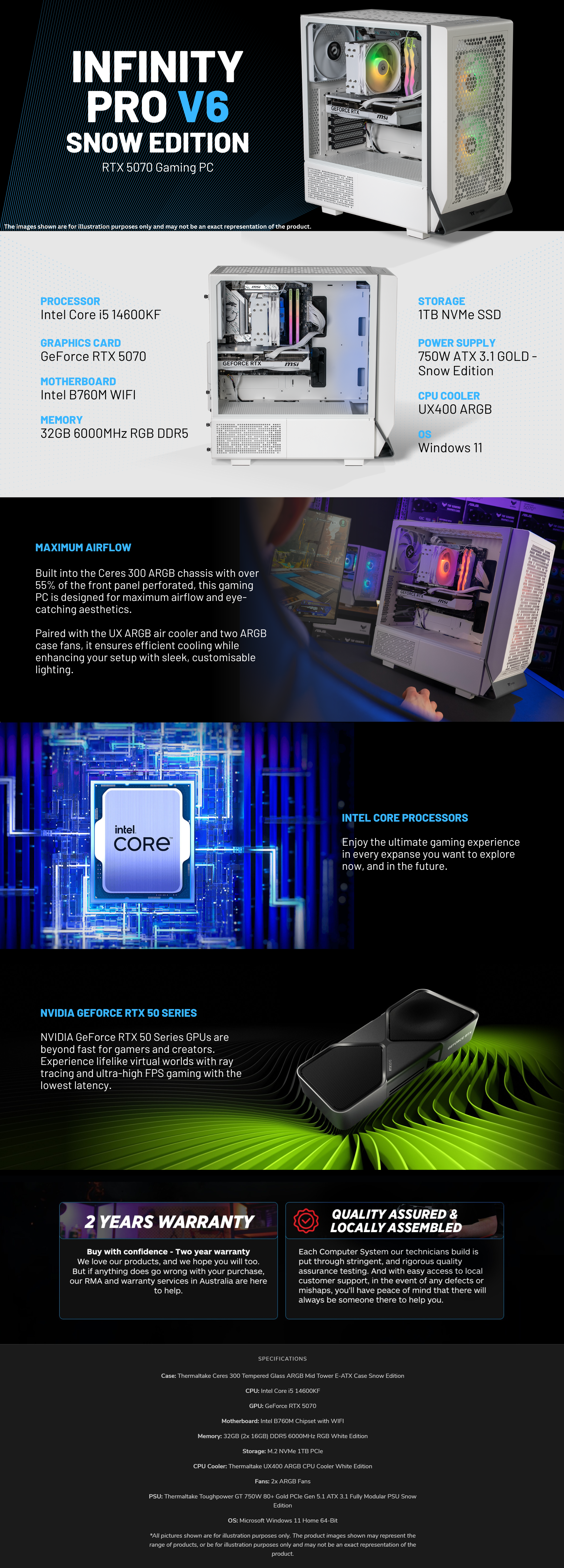 Unlock infinite gaming possibilities with the Infinity Pro V6 Snow. Housed in our stunning Ceres 300 case, This PC takes your games to a new level by utilising the best hardware. This includes a sweet 5070 GPU and an Intel Core i5 14600KF Processor. Dominate the game, with the Infinity Pro V6.