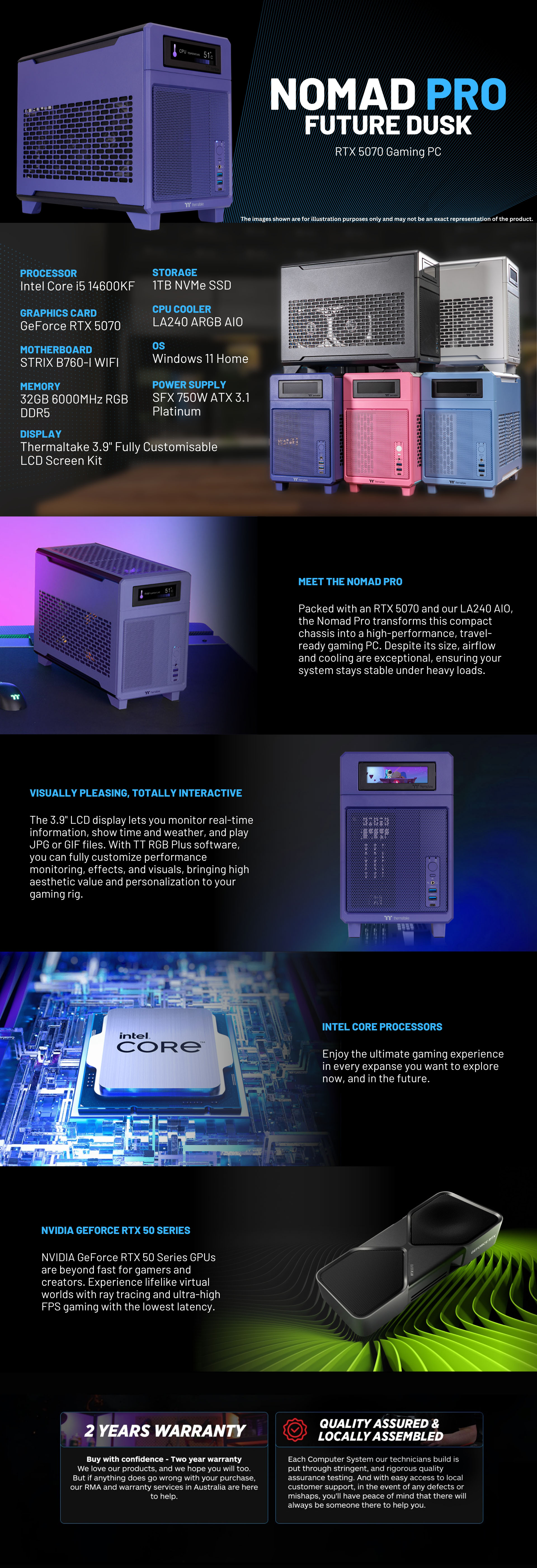 Packed with an RTX 5070 and our LA240 AIO, the Nomad PRO transforms this compact chassis into a high-performance, travel-ready gaming PC. Despite its size, airflow and cooling are exceptional, ensuring your system stays stable under heavy loads. The Nomad PRO is more than a caseits a compact powerhouse for gaming, creative work, and on-the-go performance.