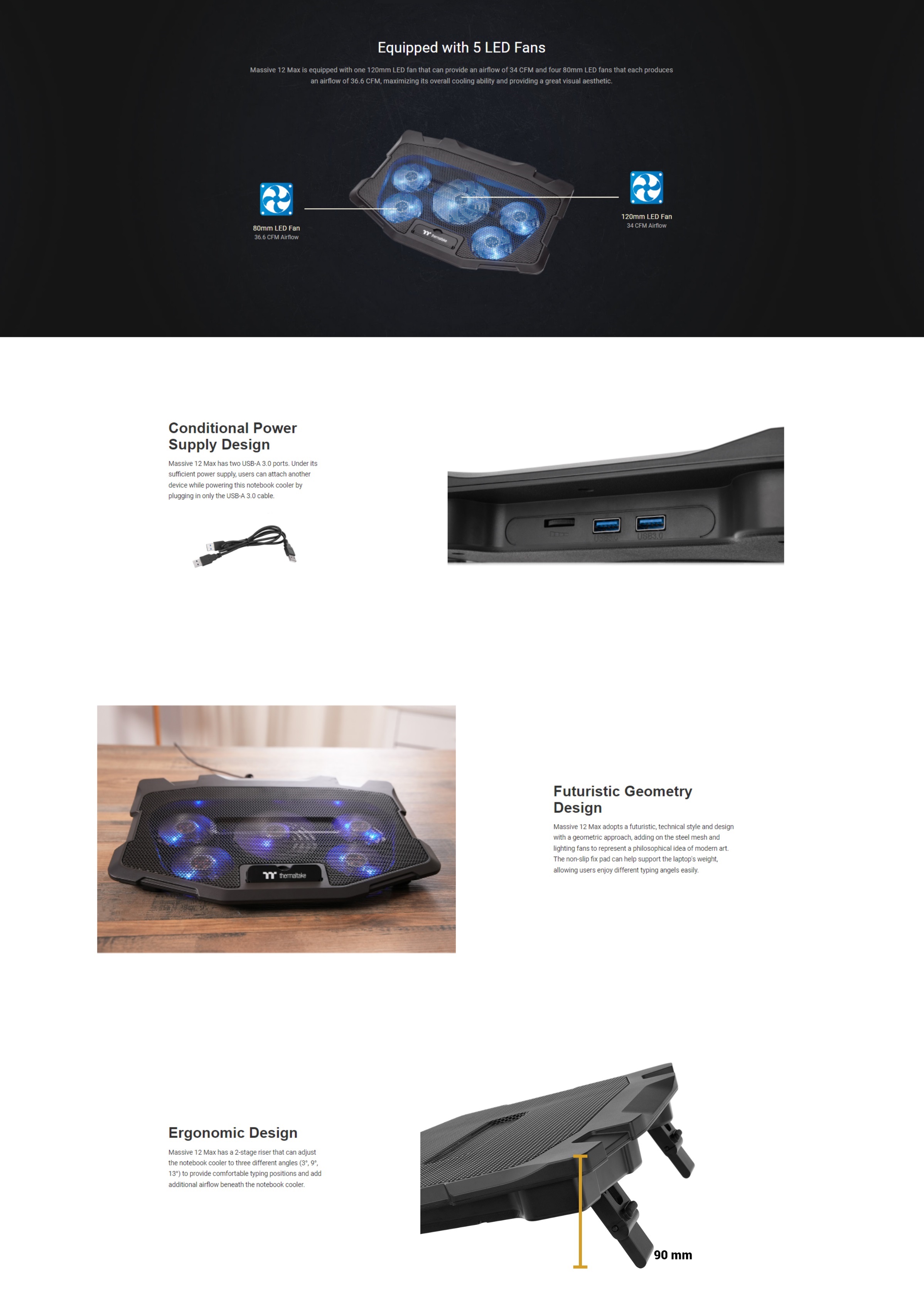 Massive 12 Max is a high-performance notebook cooler is designed for users that are looking for high cooling demands and wish to keep their laptops cool all the time. Its equipped with one 120mm and four 80mm LED fans providing an outstanding amount of airflow; it can also supports laptop sizes of up to 17 inches while providing a 2-stage riser that can elevate the laptop to fit a more comfortable typing angle.