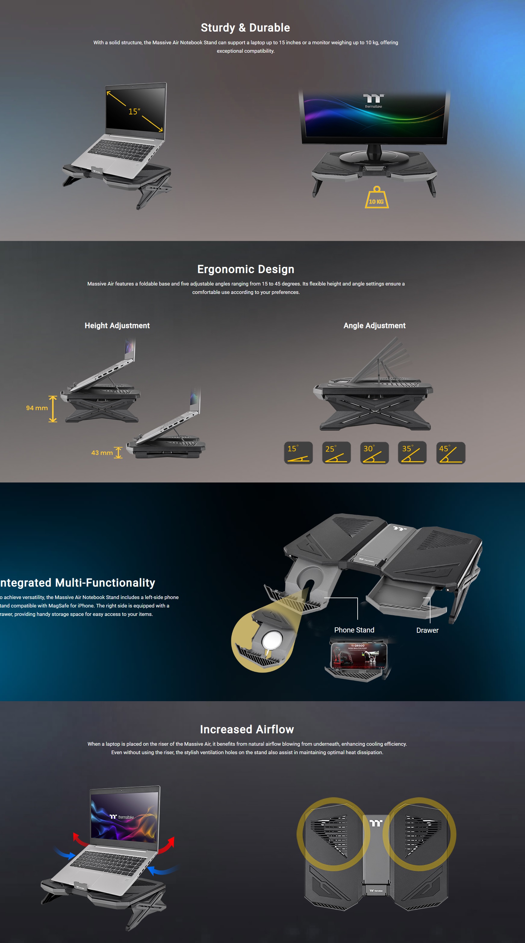 Massive Air is a multi-functional notebook stand designed for great convenience and optimized airflow. The stand features flexible height and angle adjustment for perfect device placement. The built-in phone stand and drawer provide more space utilization to elevate your use experience.